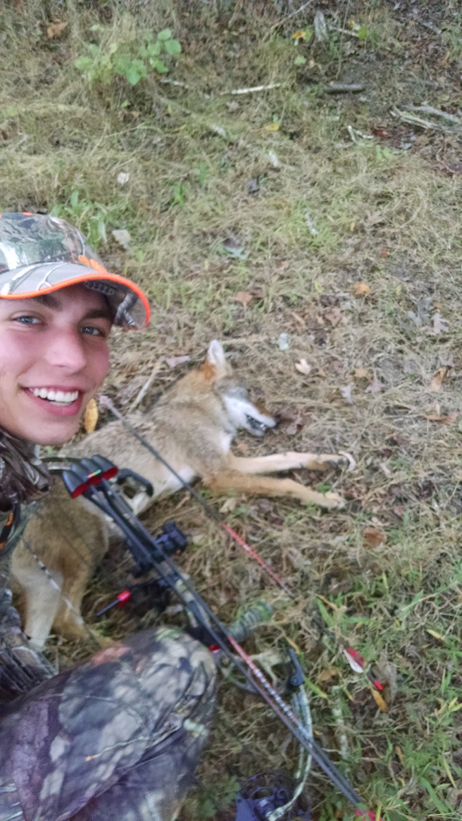 I was in the stand about 4:30ish. Maybe some people will get on to me and be like "be in the stand earlier!" Don't care. I've got it down to where I know deer appear around 6 in the early season and 5:15 in the late season. So I'm there a while before the deer are. After about an hour and a half, right at 6, I look right and there is a 6 point buck, he just kind of appeared, I never heard him walk up, but ok then. Not big enough to shoot (maybe half the size of the 8 point I got last year) , I decided to let him pass, a doe came out. I stood up slowly when the deer weren't looking, but I never got a shot on the doe. They simply walked off into the woods at my 2 o'clock. Still standing after about 5 or so minutes, I look to my left into the woods at my 9 o'clock. I see 4 legs walking through the brush, but I notice it's not a deer...this is a coyote. Now I beg for him to turn right, towards my stand, so that I could have a shot. Sure enough, he does. I wait till his head goes behind a tree to draw, and hold on my anchor point and aim. The coyote, after coming from behind the tree, is still hidden by briars grown up next to the tree. I hold the bow back for another 10 or 15 seconds (forgive me for inaccurate time, it seemed like I held the bow forever when it was probably just a few moments), and finally I get a shot. 20 yards, WHAP! The sound of an arrow hitting its mark. The coyote did not make it a few feet before it fell, the Muzzy Mx-4 having done it's work. After giving it a few minutes to expire, I got down from the stand to see my first coyote kill.